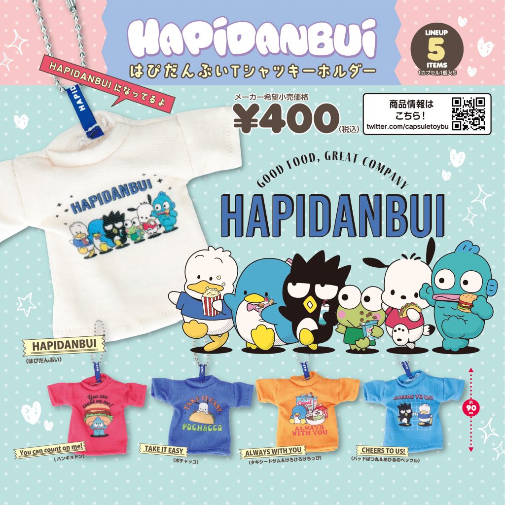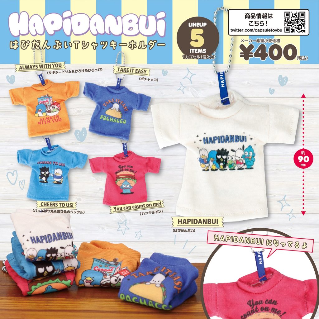 株式会社サンリオのキャラクターより、ポチャッコ、タキシードサム、けろけろけろっぴ、バッドばつ丸、ハンギョドン、あひるのペックルの個性あふれる6人の男のコたちで結成されたユニット「はぴだんぶい」をモチーフに、80年代にあったようなポップでレトロなカラーリングのミニTシャツに仕上げました。全長約9㎝(ボールチェーンを除く)のサイズながら、ネックリブや裾、袖周りのステッチまで、Tシャツの細かなディティールを表現しています。首周りのタグにはボールチェーンが付いており、バッグや鍵など好きなところに取り付けられます。本物のTシャツのような縫製とデザインにこだわったアイテムです。