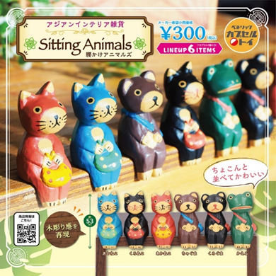 東南アジアのお土産ショップなどで見かける木製の動物たちの置物をイメージし、ミニチュアサイズのインテリアとして表現したカプセルトイシリーズです。全高およそ5cm程の手のひらに収まるサイズながら、木製風の木目や質感も丁寧に表現しています。