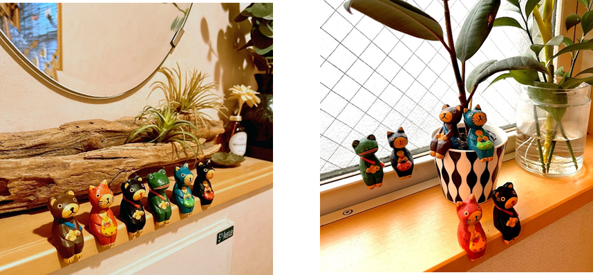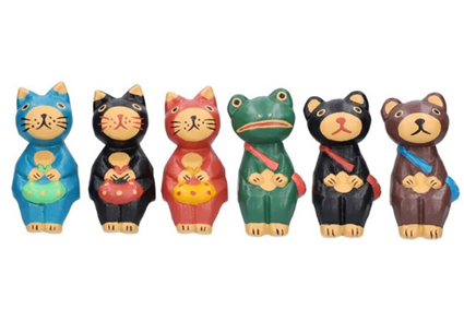 アジアンテイストなカラーリングのねこ、くま、かえるの動物たち全6種がラインアップ。デスク周りや玄関などに飾って、気軽に南国の雰囲気をお楽しみいただけます。カラフルな鞄を持ってちょこんと座る動物たちのかわいらしい姿が、日常のふとした瞬間に癒しをお届けします。