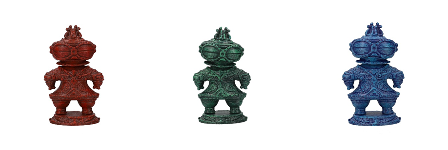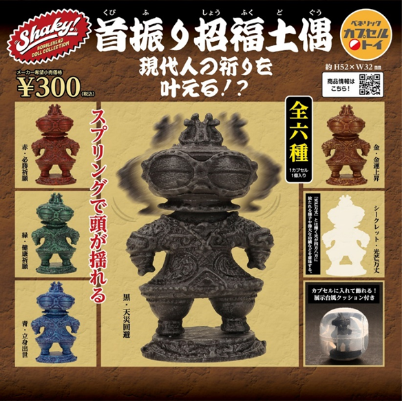 首振り人形のカプセルトイ「Shaky!」シリーズに、スプリングでブルブルと頭が揺れる“土偶”が登場します。”赤・必勝祈願””緑・健康祈願””青・立身出世””金・金運上昇””黒・天災回避”など全6種のカラーで、内1種の、輝く光が四方八方に放たれる様子や偉大な功績などを意味する”光芒万丈(こうぼうばんじょう)”はシークレットです。クッション性のある台座付きで、カプセルを展示ケースのように飾る事ができます。どんな種類が出てくるかはカプセルを開けてみてのお楽しみ!年末年始に運試し気分で楽しめる「Shaky! 首振り招福土偶」を全国のカプセルトイ自販機コーナーにてお楽しみください。