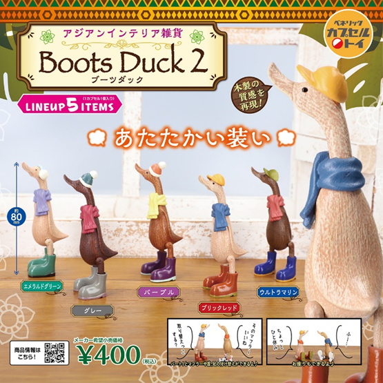 東南アジアのお土産ショップなどで見かける、ブーツを履いた木製のアヒルの置物をイメージしたカプセルトイ“Boots Duck(ブーツダック)”が冬バージョンになって登場します。今回はカラフルな帽子やイヤーマフ、あたたかそうなマフラーを身に着けた冬じたくのコスチュームで、他の種類と帽子やマフラーのパーツを付け替えて楽しめます。全長約8㎝のミニサイズながら、木製風の木目の色合いや質感も丁寧に再現しており、足の角度を変えてお座りした状態で飾ることもできます。カラーリングはブーツやマフラーの色が異なる「エメラルドグリーン」「グレー」「パープル」「ブリックレッド」「ウルトラマリン」の全5種類です。
