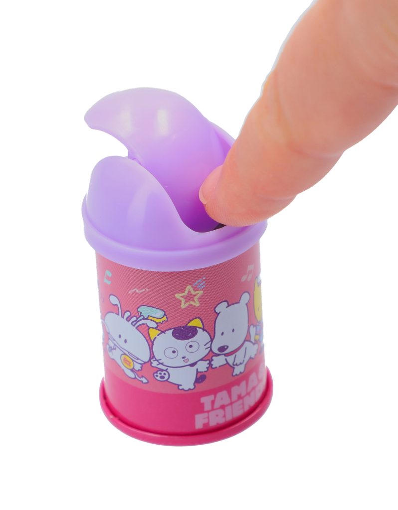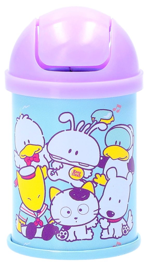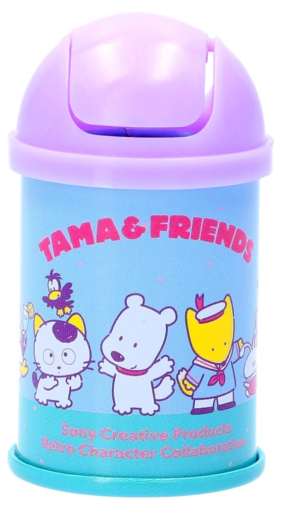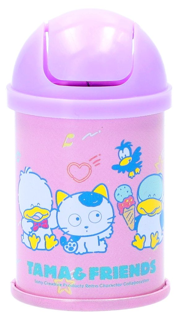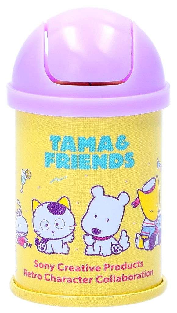 レトロな雰囲気のミニサイズのゴミ箱缶です。缶の底面の絵柄は、タマ&フレンズではおなじみのタマとポチをはじめ、ソニー・クリエイティブプロダクツのオリジナルキャラクター「バイキンくん」と「レッツチャット」「マリーン スカウツ」たちを含めた全6種のラインアップ。側面はパステルな色合いとたくさんのキャラクターたちが目を引くデザインで、デスクに並べてインテリアとして楽しむのはもちろんのこと、フタがスイングする仕様なので、クリップや付箋などの細かいものを仕分ける小物入れとして活用できます。フィギュアやぬいぐるみと組み合わせて飾ったり、一緒に写真を撮ったりするのもおすすめです。