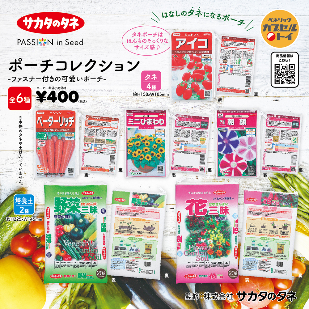 2013年に創業100年を迎えた老舗種苗会社「サカタのタネ」のタネと培養土パッケージデザインのカプセルトイ商品が新登場。ポーチのデザインはお花や野菜のタネ「ミニトマト アイコ」「ニンジン ベーターリッチ」「ミニひまわり」「朝顔」のほか、培養土の「野菜三昧」「花三昧」の全6種がラインアップ。