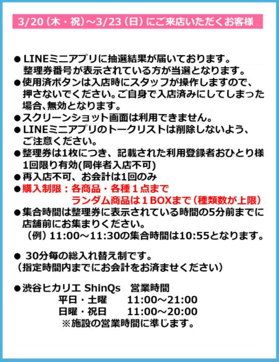 混雑緩和・危険防止のため、3月20日(木・祝)~3月23日(日)の4日間は事前応募による時間指定整理券をお持ちの方のみご入店いただけます。