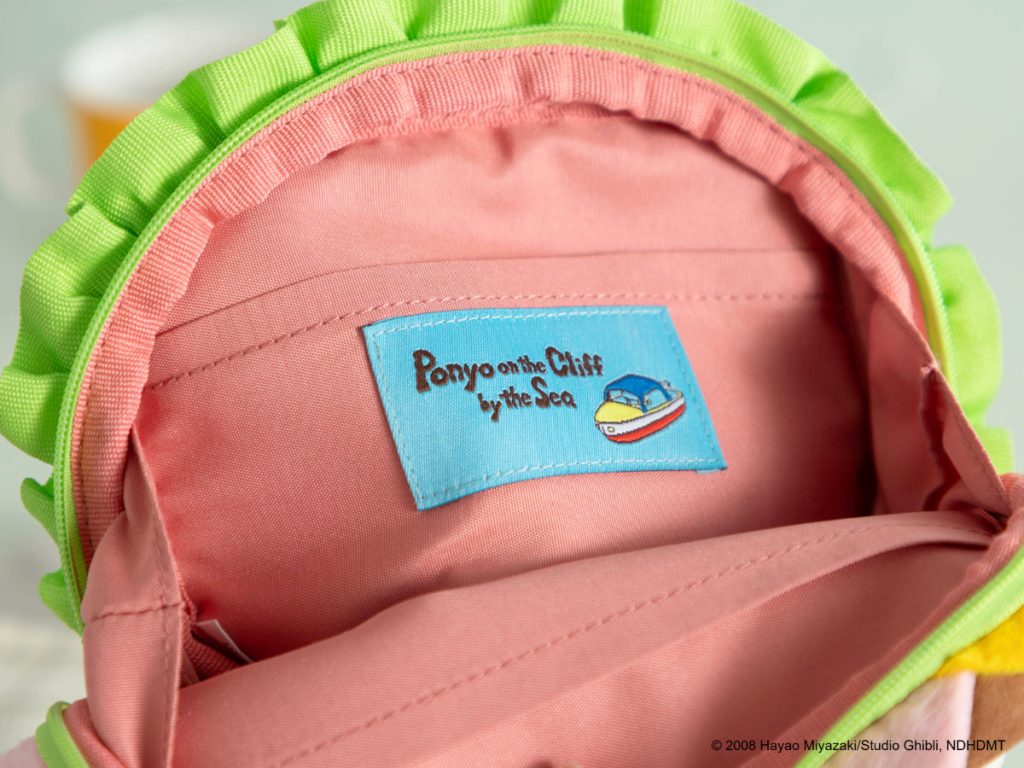 そして注目は、ファスナー部分のチャーム。ハムをねらって大きく口を開けたポニョが、刺繍合皮でちょこんとついていて、なんとも愛らしいアクセントに。ファスナーを動かすたびに、ハムに近づこうとするポニョの姿が見えて、思わず笑顔になってしまう、そんな楽しい仕掛けが施されています。