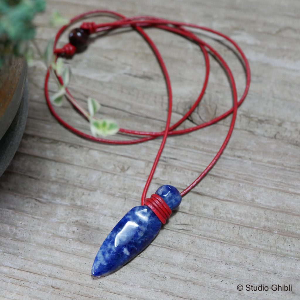 天然石のソーダライトを使用した、アシタカがサンに渡した”玉の小刀”がモチーフのペンダントです。ソーダライトは「邪悪なものから身を守る石」として、心の内の邪念や恐怖心を静め、悪への誘惑を断ち切り、正しいことを行う勇気と行動力を与えてくれるといわれています。「もののけ姫」の作品にぴったりの天然石を使用したアイテムです。