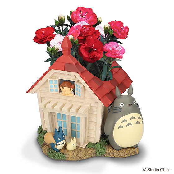 立体で表現された「となりのトトロ」や「魔女の宅急便」のワンシーンを思い起こすようなプランターと、お花が咲いたあとも育てやすい色鮮やかなカーネーションがセットになっています。