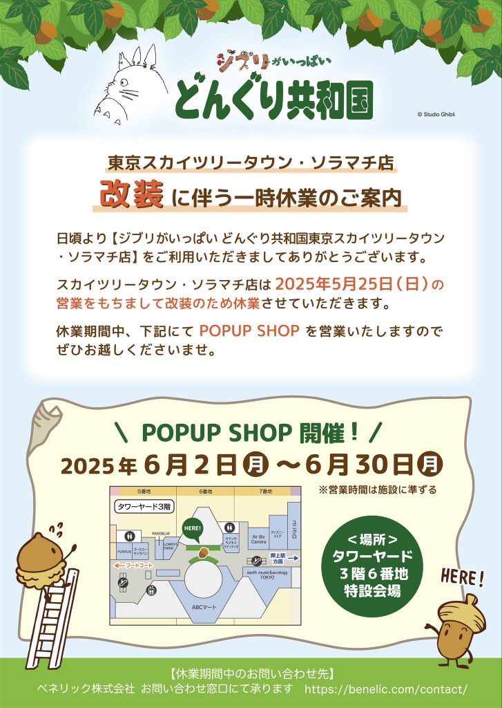 平素よりジブリがいっぱい どんぐり共和国東京スカイツリータウン・ソラマチ店をご愛顧いただきまして、誠にありがとうございます。