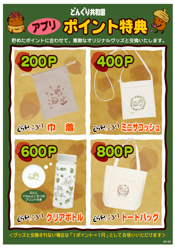 2024.02.27 ポイント特典リニューアルのお知らせ 日頃よりジブリがいっぱい どんぐり共和国をご利用いただきましてありがとうございます。ポイントアプリリリースに伴い、ポイント特典がリニューアルいたします。 添付の画像をご覧下さいませ。 ※フランチャイズ(FC)店のポイント特典も同様にリニューアルとなります。 ポイントアプリは3月1日(金)10時よりリリース予定です。続報をお待ちくださいませ。