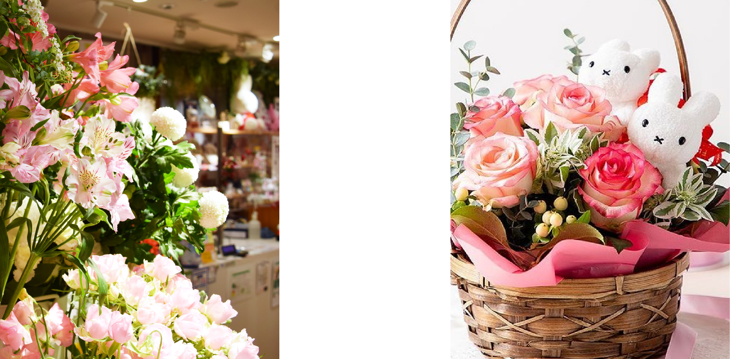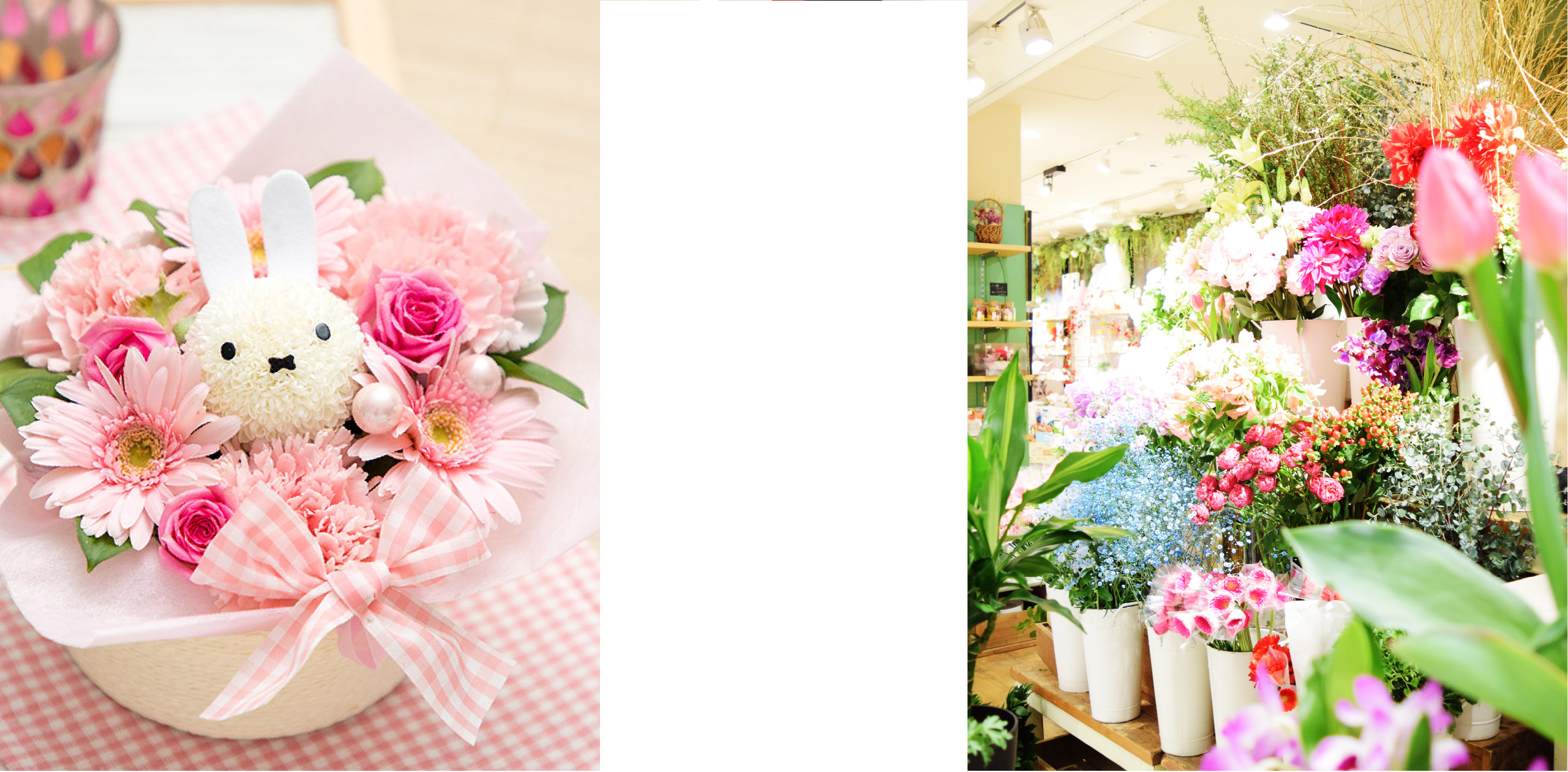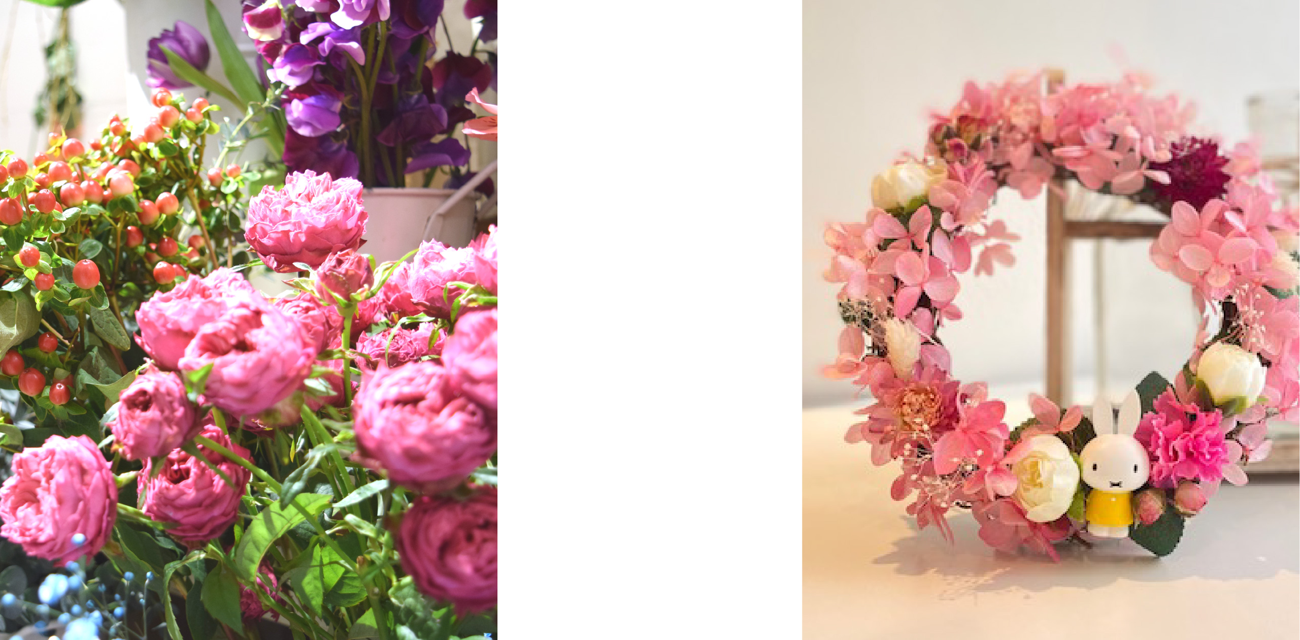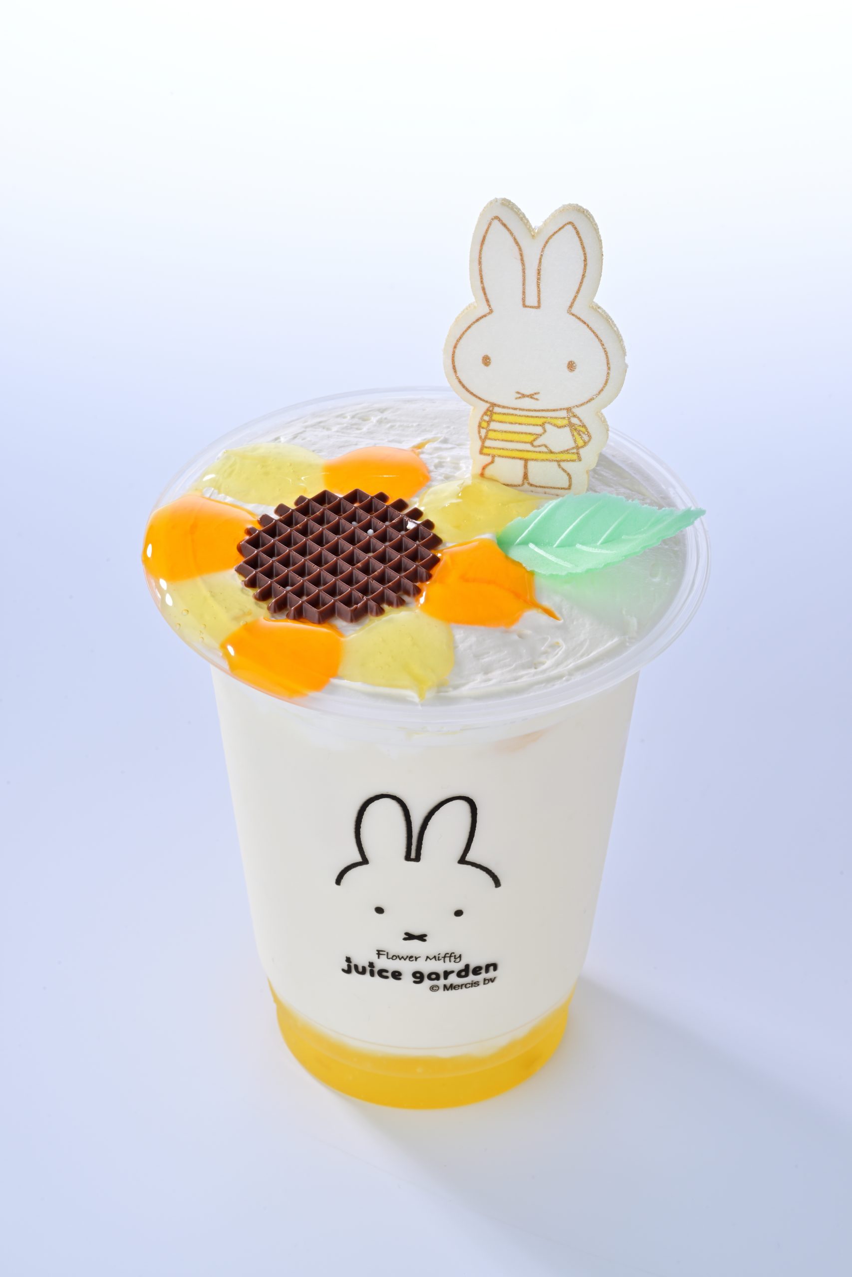 気軽に楽しめるアートフラワーブーケやフラワーミッフィーオリジナルグッズがございます。季節のドリンクと華やかなスイーツが楽しめる「Flower Miffy juice garden」も併設。