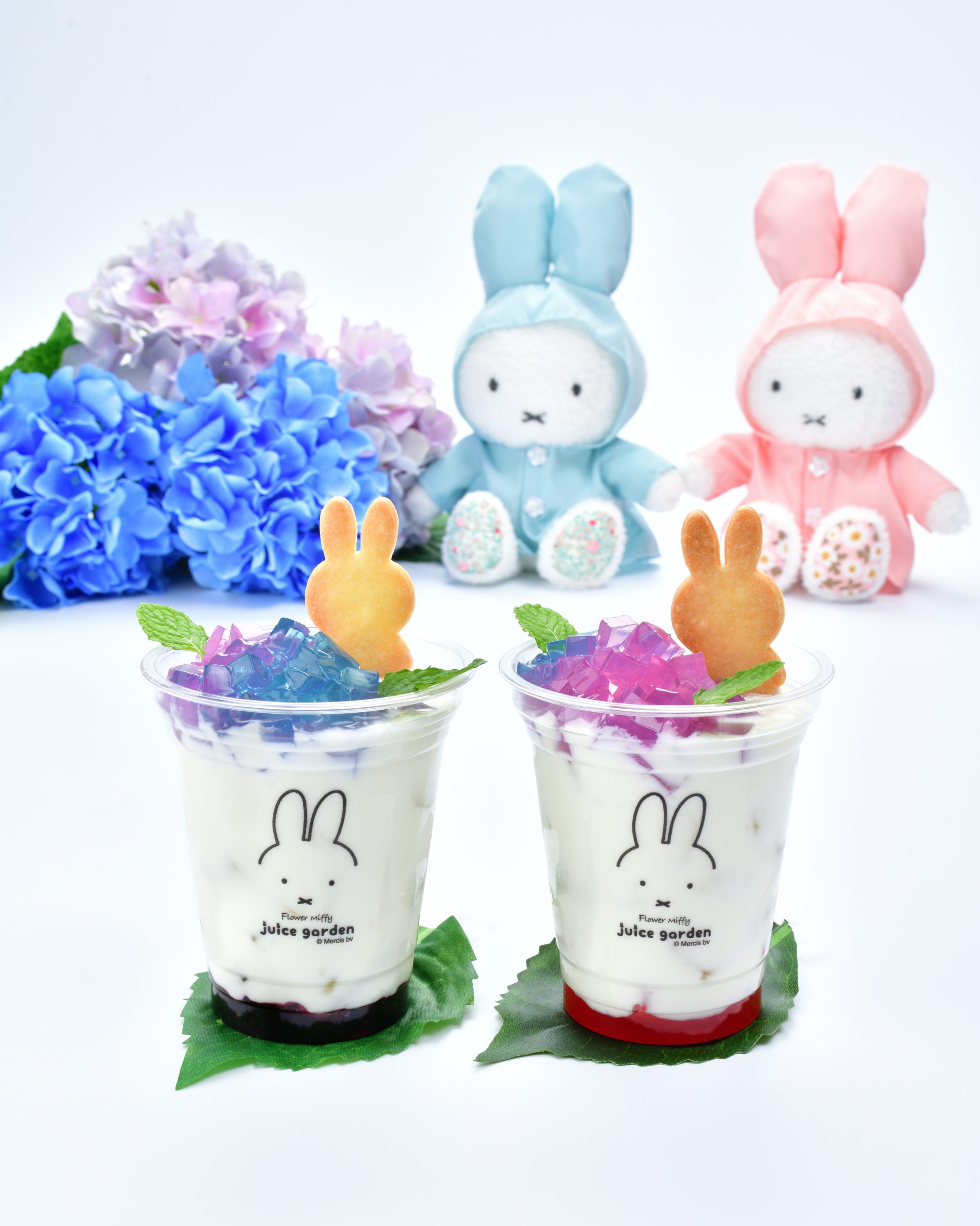 フラワーミッフィー ジュースガーデンにあじさいに見立てたゼリーが美しいヨーグルトドリンクが登場です♪