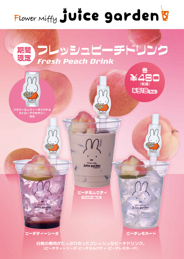フラワーミッフィージュースガーデンのレギュラーメニューにフレッシュピーチドリンクが仲間入り🍑