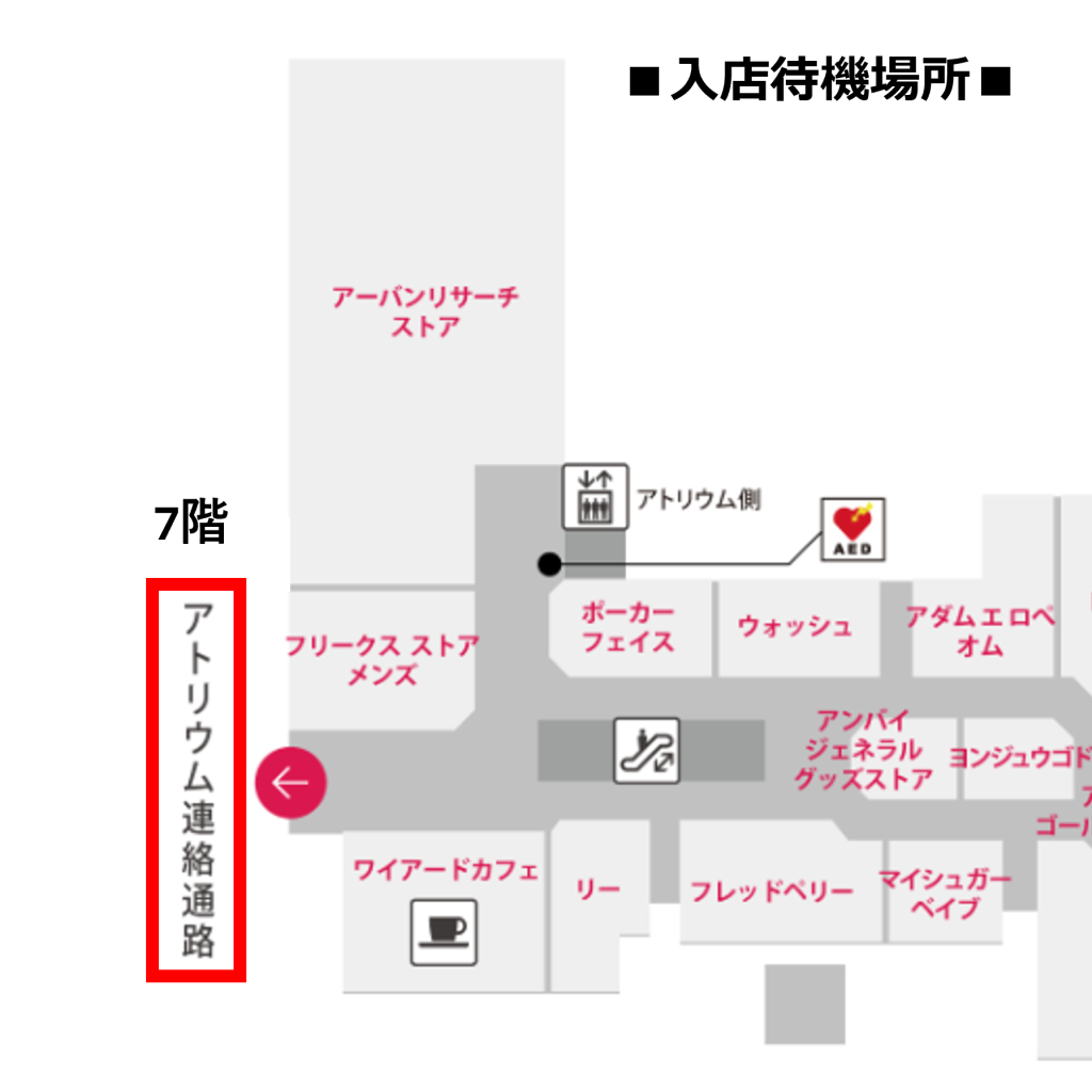 開店前に入場待機列へお並びいただいたお客様のご案内終了後、順番に店内へご案内させていただきます。店内の混雑状況により、7F連絡通路にお並びいただく可能性がございます。