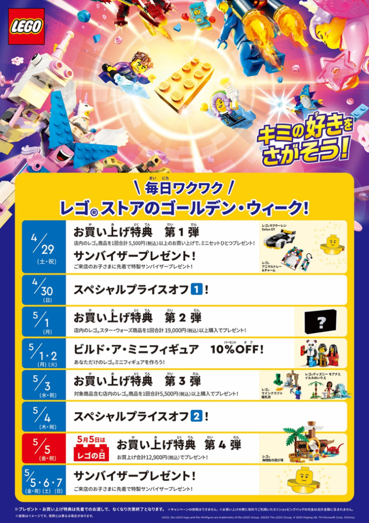 4月29日(土)より、全国のレゴ®ストアでは『毎日ワクワク!レゴストアのゴールデンウィーク』がスタートします。毎日お楽しみをご用意してみなさまをお待ちしています。