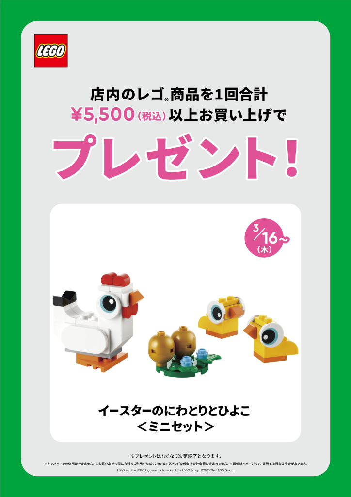 3月16日(木)より、全国のレゴ®ストア、レゴポップアップストアミント神戸、レゴ®ストア楽天市場店でお買い上げ特典キャンペーンを実施いたします。