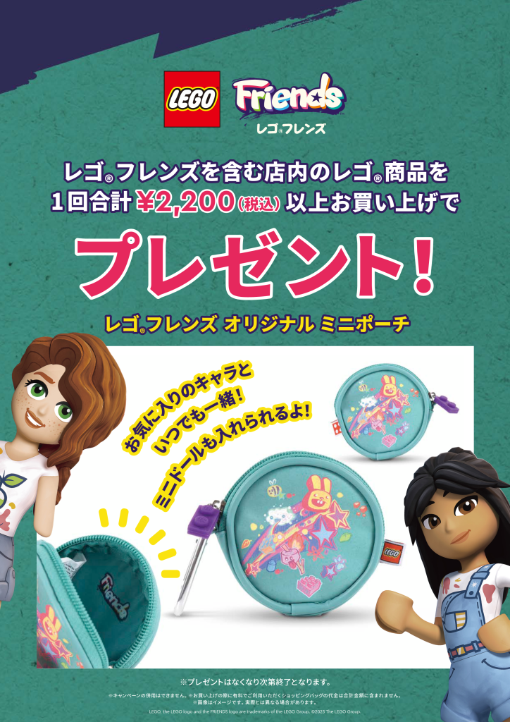 レゴ®フレンズを含む店内のレゴ商品を1回のお会計につき合計2,200円(税込)以上お買い上げで、レゴ®フレンズオリジナルミニポーチ をプレゼント!