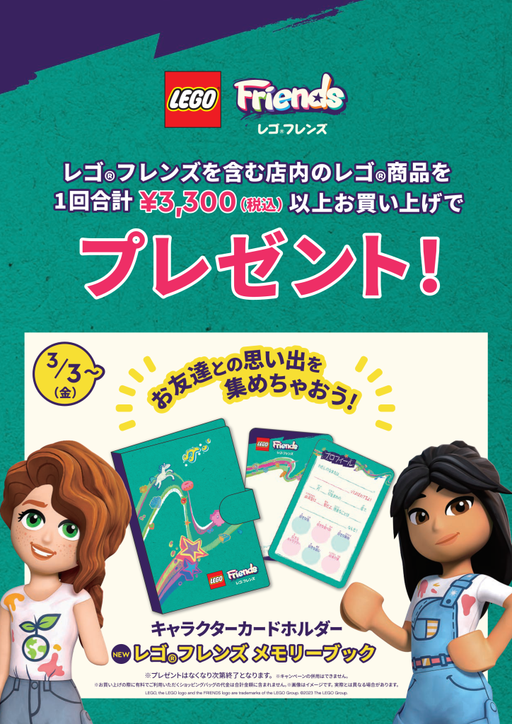 【3月3日スタート!!】レゴフレンズを含む店内のレゴ商品を1回合計3,300円(税込)以上お買い上げで キャラクターカードホルダーレゴフレンズメモリーブックをプレゼント!