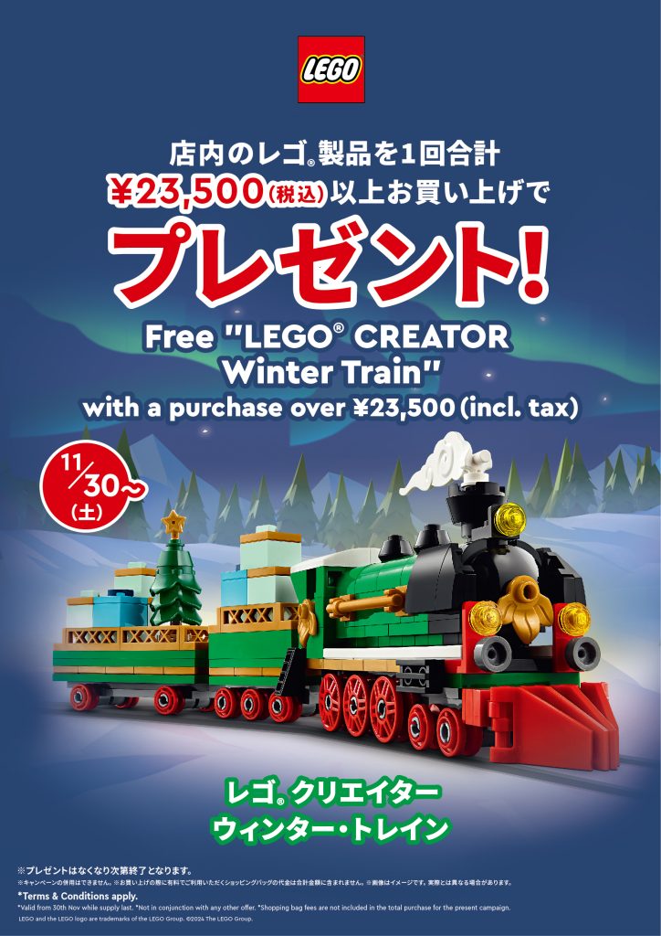 店内のレゴ製品を1回合計23,500円(税込み)以上をお買い上げの方にレゴ クリエイター ウィンター・トレインをプレゼント!