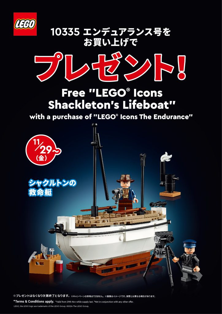 レゴストアでは、11月29日(金)から、エンデュアランス号(10335)をお買い上げで、シャクルトンの救命艇をプレゼントいたします。