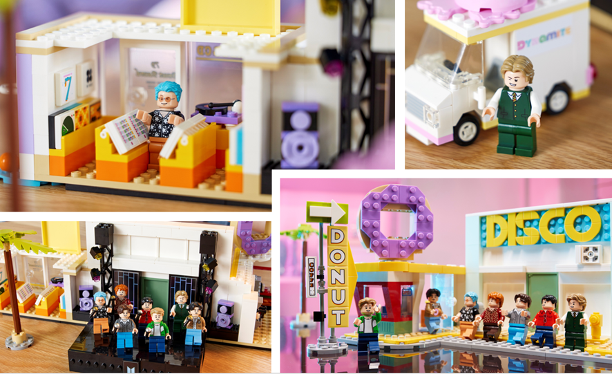 本セットは、活気あふれるドーナツショップや、アイスクリームトラック、レコードストアなど、BTSのクリエイティブな表現が盛り込まれています。建物ごとに完全に取り外すことができ、個別に遊んだり、飾ったりすることが可能です。