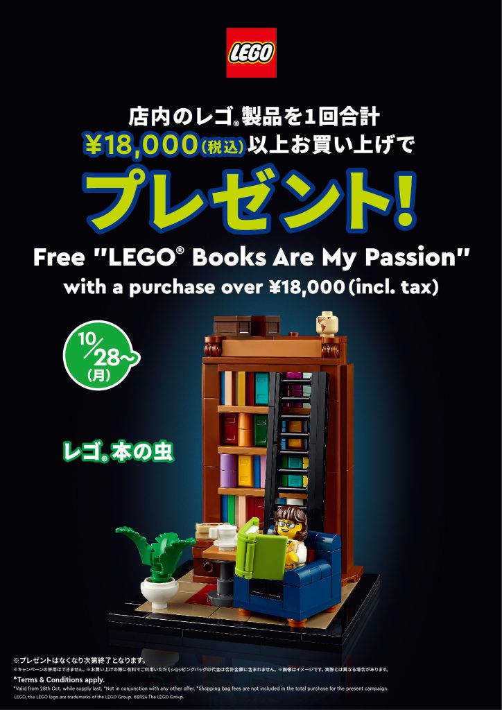 10月28日から、店内のレゴ製品を1回合計18000円(税込み)以上をお買上げのお客様に『レゴ ® 本の虫』をプレゼント!