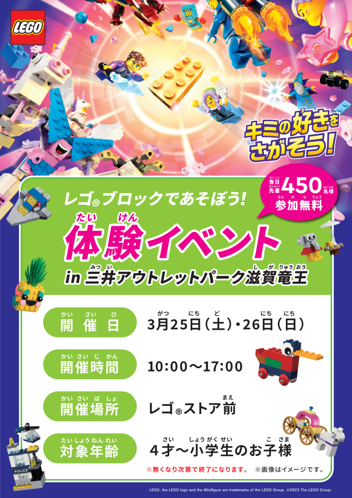 2023.03.23 3/25~3/26 【レゴストア滋賀竜王店】体験イベント開催! レゴブロックであそぼう!体験イベント 日時:3/25(土)3/26(日)各10:00〜17:00場所:三井アウトレットパーク滋賀竜王 2階レゴストア前 参加無料のイベントでレゴブロックを遊びつくそう!体験したブロック作品はプレゼント! ※雨天の場合、中止する場合がございます。※参加は4歳から小学生のお子様限定となります。 ※なくなり次第終了になります。 ※詳細は店舗までお問合せ下さい。 < back