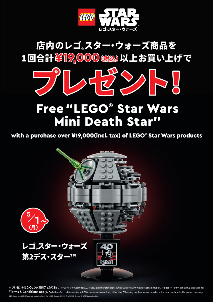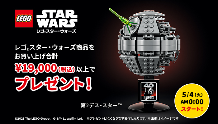 レゴ®ストアの店内のレゴスター・ウォーズ商品を1回のお会計につき合計19,000円(税込)以上お買い上げで、レゴスター・ウォーズ第2デス・スターをおひとつをプレゼント!