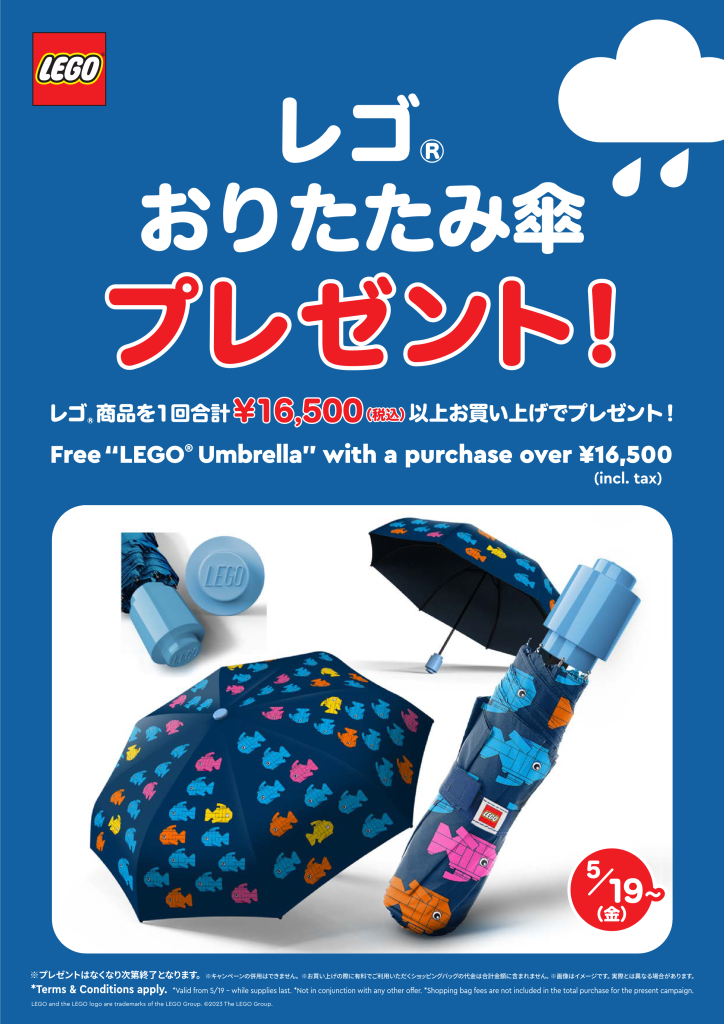 レゴ®ストアの店内の商品を1回のお会計につき合計16,500円(税込)以上お買い上げで、おりたたみ傘をおひとつをプレゼント!