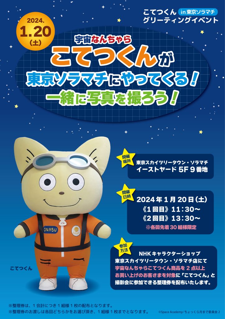 NHKキャラクターショップ東京スカイツリータウン・ソラマチ店にて宇宙なんちゃらこてつくん商品を2点以上お買い上げのお客さまを対象に「こてつくん」と撮影会に参加できる整理券を配布いたします。