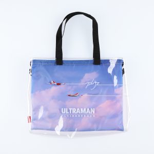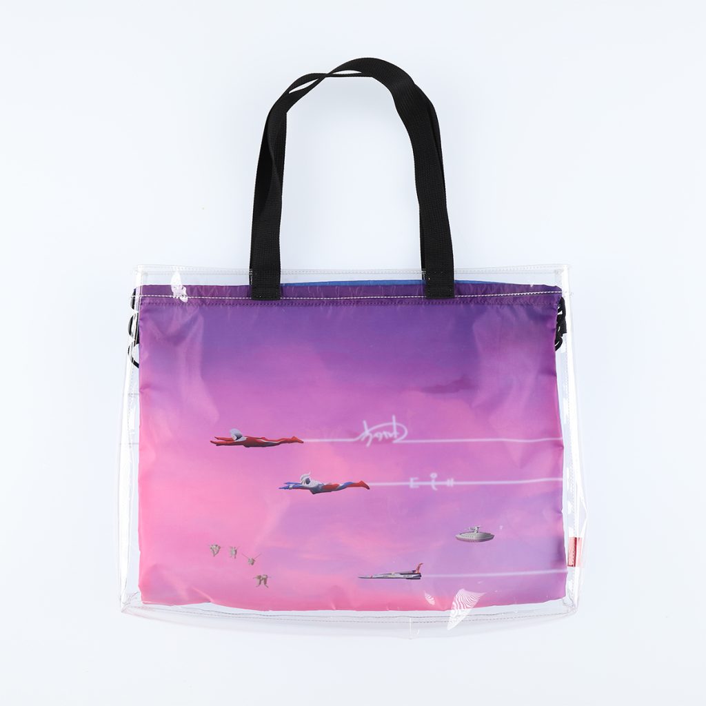透明のクリアバッグと巾着がセットになった、幅40㎝と大き目なサイズのトートバッグです。巾着はクリアバッグに装着して重ねてご使用いただける他、単体でも持ち歩きができます。巾着のデザインは前面と背面で異なり、青空または夕暮れ時の空に飛行するウルトラヒーローたちをデザインしています。気分に合わせて裏と表お好きな面を正面にしてご使用いただけます。