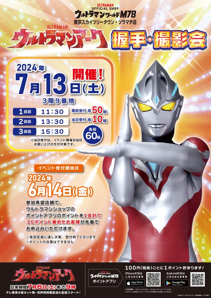 2024年7月6日(土)あさ9時より、テレ東系6局ネット発・世界同時期放送&配信スタート『ウルトラマンアーク』との握手・撮影会の受付が2024年6月14日(金)よりウルトラマンワールドM78 各店で始まります!