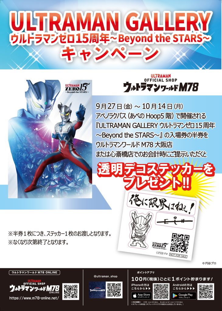 9月27日(金)~10月14日(月)にアベノラクバス(あべのHoop5階)で開催される『ULTRAMAN GALLERY ウルトラマンゼロ15周年〜Beyond the STARS〜』の半券をウルトラマンワールドM78大阪店、または心斎橋店でのお会計時にご提示いただくと透明デコステッカーをプレゼント!