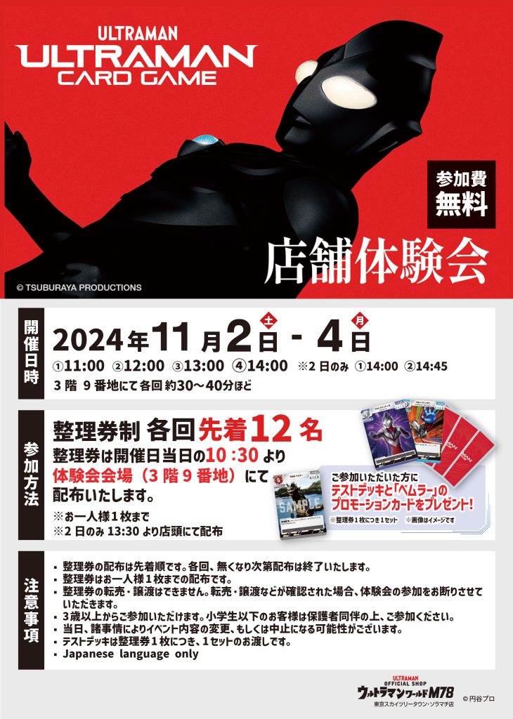 ※11月2日(土)のみ、①14:00~(集合時間13:55)、② 14:45~(集合時間14:40)の実施となります。整理券は13:30より東京ソラマチ 4階「ウルトラマンワールドM78」店頭で配布します。