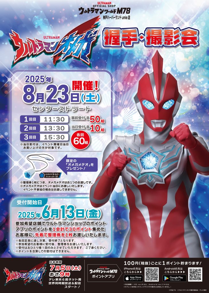 2025年7月5日(土)あさ9時より、テレ東系6局ネット発・世界同時期放送&配信スタート『ウルトラマンオメガ』との握手・撮影会の受付が2024年6月13日(金)よりウルトラマンワールドM78 各店で始まります!