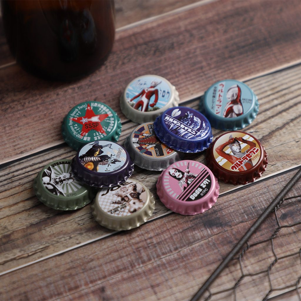 昭和のヒーローや怪獣たちが、ジュースやビールの王冠みたいなバッジになって登場!