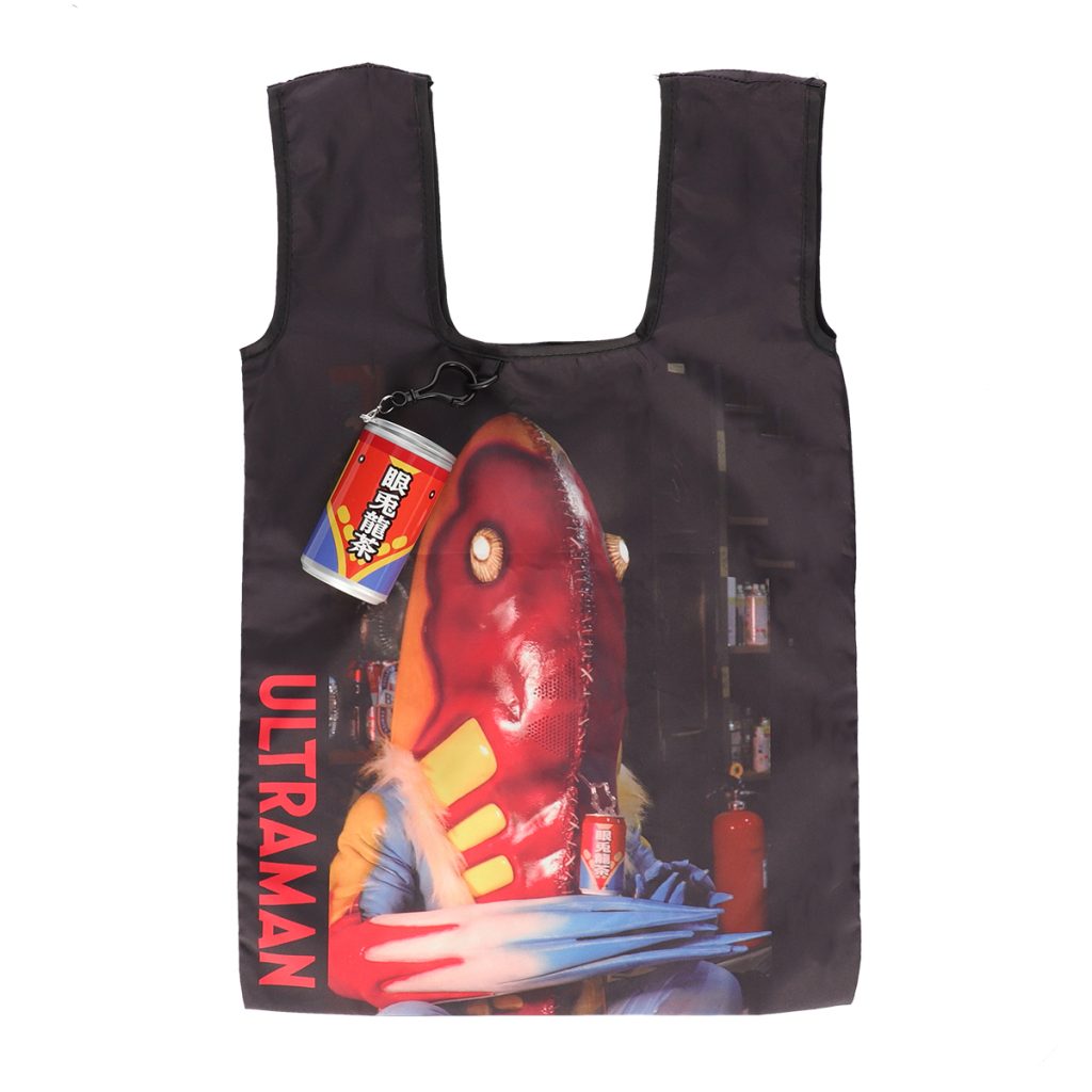 『ウルトラマンマックス』第24話「狙われない街」に登場した「メトロン星人」が取り出した眼兎龍茶イメージした缶の中に、ストローを使って「グゥー!」っと眼兎龍茶を飲むメトロン星人のエコバッグが入っています。