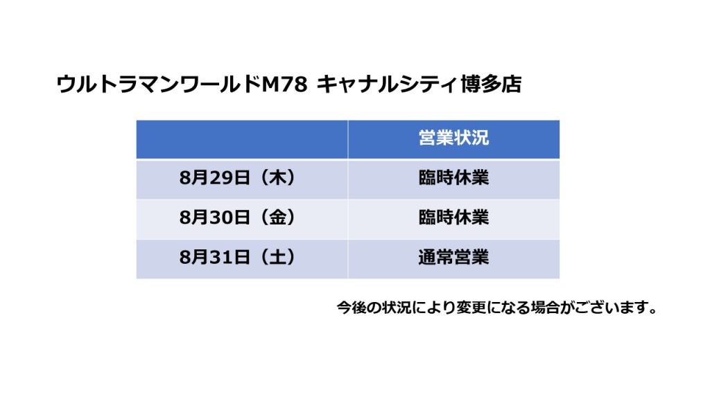 台風接近に伴い、ウルトラマンワールドM78 キャナルシティ博多店は8月29日(木)、30日(金)は臨時休業とさせていただきます。